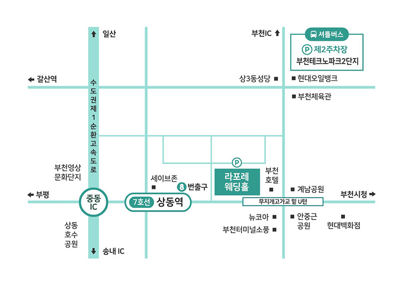 주소 및 연락처 Address 도로명 주소경기 부천시 원미구 길주로 125다승프라자 7층~8층 라포레웨딩홀 지번 주소경기 부천시 원미구 상동 538-7 대표전화 032-323-7700 팩스번호 032-323-7702 티맵 바로 연결 → 카카오맵 바로 연결 → 네이버 지도 크게 보기 → 약도 및 교통 안내 지하철 이용시 7호선 상동역 ⑧번 출구 도보 1분 거리내에 라포레웨딩홀이 있습니다. 버스 이용시 상동역8번출구.세이브존 정류장 하차 간선버스 24, 37, 87 일반버스 6-2, 23-2, 50-1, 52, 56, 59, 59-1, 66, 70 광역버스 1601, 9300 직행버스 1001, 8906 실시간 버스노선 자가용 이용시 네비게이션 : "라포레웨딩홀" 또는 "길주로 125" 입력 티맵 바로 연결 카카오맵 바로 연결 [도로명 주소] 경기 부천시 원미구 길주로 125 [지번 주소] 경기 부천시 원미구 상동 538-7 약도 인쇄 및 다운로드 약도 인쇄하기 약도 다운로드(PDF) 주차장 안내 제1주차장 : 본건물 주소경기도 부천시 원미구 길주로 125 제2주차장 : 부천테크노파크 2단지 / 셔틀버스 운행 주소경기 부천시 원미구 송내대로 388 부천테크노파크 2단지 셔틀버스부천테크노파크 2단지 후문 ↔ 라포레웨딩홀 정문 승차 위치부천테크노파크 2단지 후문 운행 간격예식 1시간 전부터 10분 간격으로 운행 교통약자 우선 주차로 일반 하객분들은부천테크노파크 제2주차장 이용을 부탁드립니다.